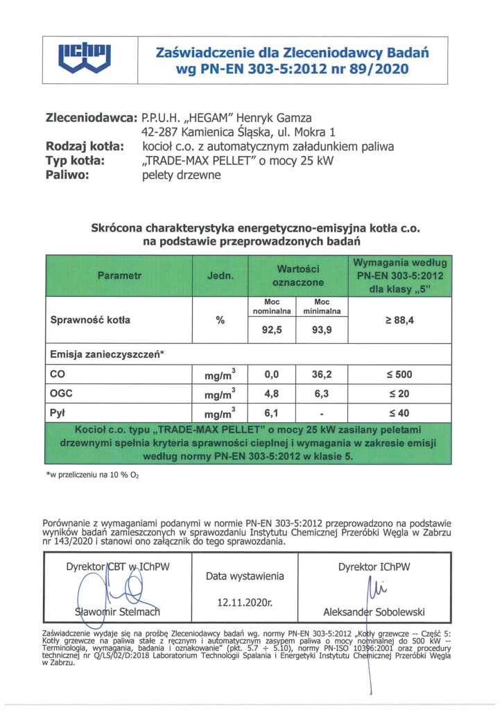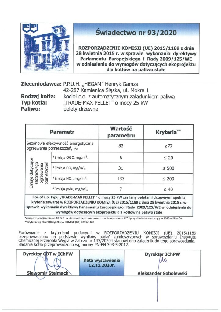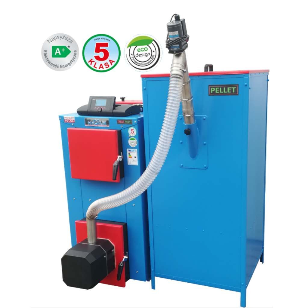 Kotły typu TRADE MAX – PELLET to ekologiczne kotły nowej generacji, przystosowane do spalania biomasy typu pellet. Kotły TRADE MAX – PELLET wyposażone są w samoczyszczący palnik pelletowy firmy – PELLASX. Spełniają wymagania energetyczno–emisyjne klasy 5. wg Normy PN-EN 303-5:2012, spełniają także wymogi dotyczące ekoprojektu (ecodesign) wg rozporządzenia UE 2015/1189 oraz posiadają certyfikat efektywności energetycznej.